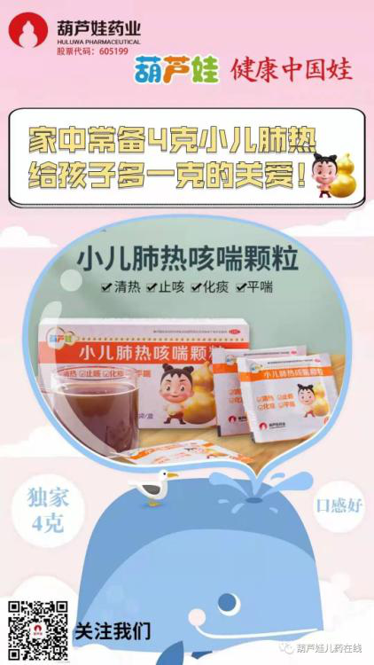 葫芦娃牌小儿肺热咳喘颗粒是依托当代著名儿科专家赵心波教授几十年临床经验,萃取医圣张仲景经典名方麻杏石甘汤和白虎汤的精华,吸收温病学家吴鞠通先生银翘散之精髓研发而成,临床上广泛应用于感冒,支气管炎,喘息性支气管炎,支气管肺炎等。2020年11月1日是第3个“世界流感日”。流感(上呼吸道感染)是一种急性呼吸道传染病,可引起病毒性肺炎,也可继发细菌性肺炎等,严重时可导致病毒性心肌炎、病毒性脑炎等多种并发症。葫芦娃牌小儿肺热咳喘颗粒(4g)为《流行性感冒诊疗方案》(2018版、2019版)推荐用药,2018年纳入新版《国家基本药物目录》,并于2019年入选新版《国家医保目录》。葫芦娃牌小儿肺热咳喘颗粒的组方麻杏石甘汤、银翘散被历代医家用于瘟疫治疗,临床专家认为该产品对于新型冠状病毒肺炎的治疗更具临床价值,国内著名药物研究机构天津药物研究院的科研团队,通过网络药理学的研究揭开了小儿肺热咳喘颗粒抗新型冠状病毒的秘密,2020年8月4日公开发表在中医药科学界权威期刊《中草药》第51卷第15期上,为葫芦娃牌小儿肺热咳喘颗粒在新型冠状病毒肺炎治疗的临床应用提供了科学理论依据。